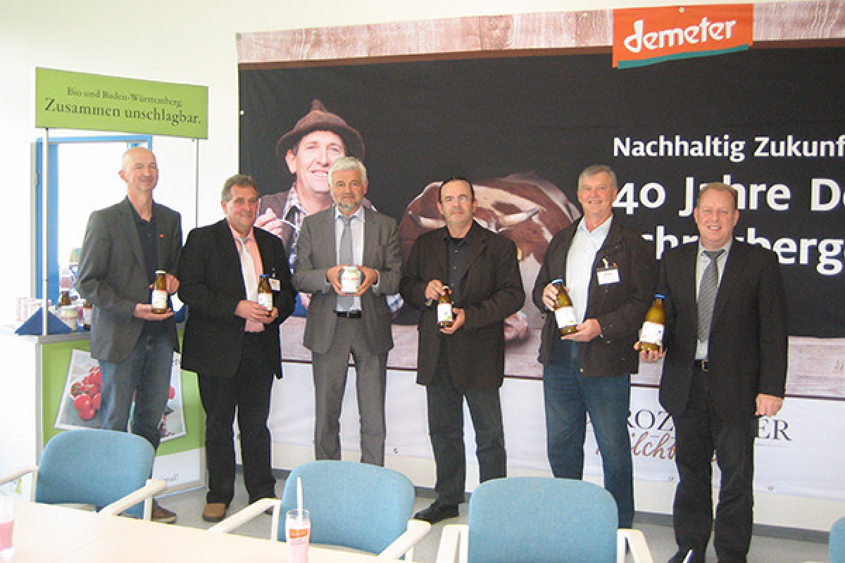 Die Produkte der Schrozberger Milchbauern jetzt mit dem regionalen Bio-Siegel des Landes Baden Württemberg. Foto v.l.n.r.: Siegfried Meyer, Reinhold Markert, Wolfgang Reimer, Klemens Fischer, Reiner Gansloser, Friedemann Vogt