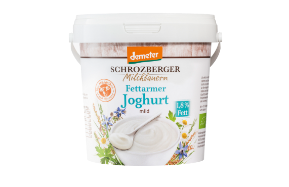 Unser natürlicher, milder Joghurt mit nur 1,8 Prozent Fett aus unhomogenisierter, fettarmer Demeter-Frischmilch.
